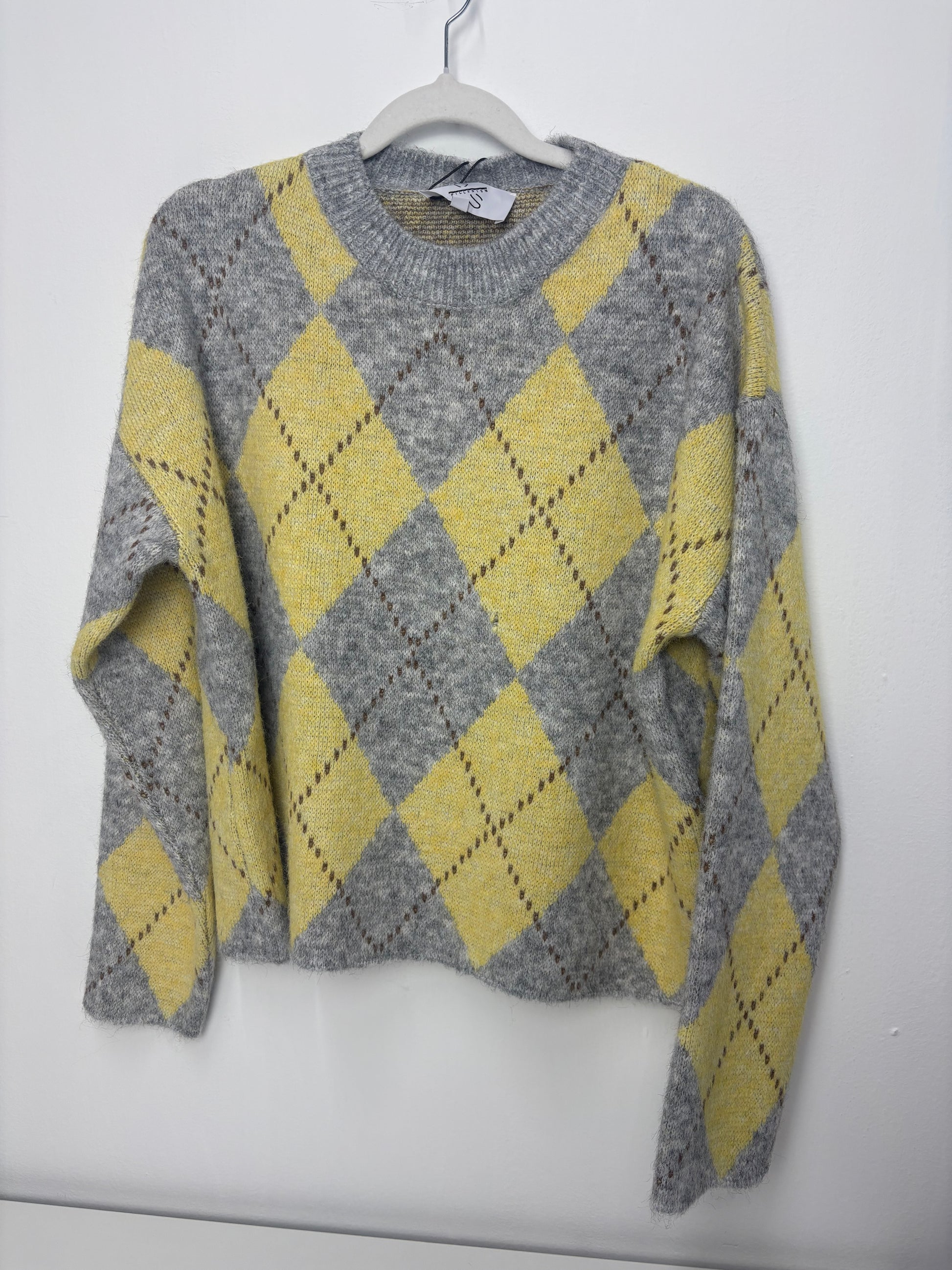 Jersey de Mujer de Lana con Dibujo de Rombos en Tonos Grises y Amarillo – Trapio